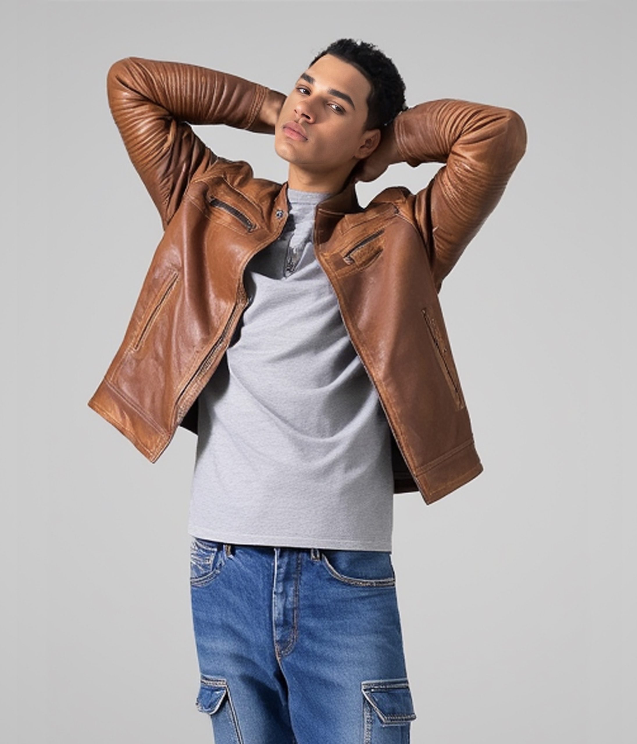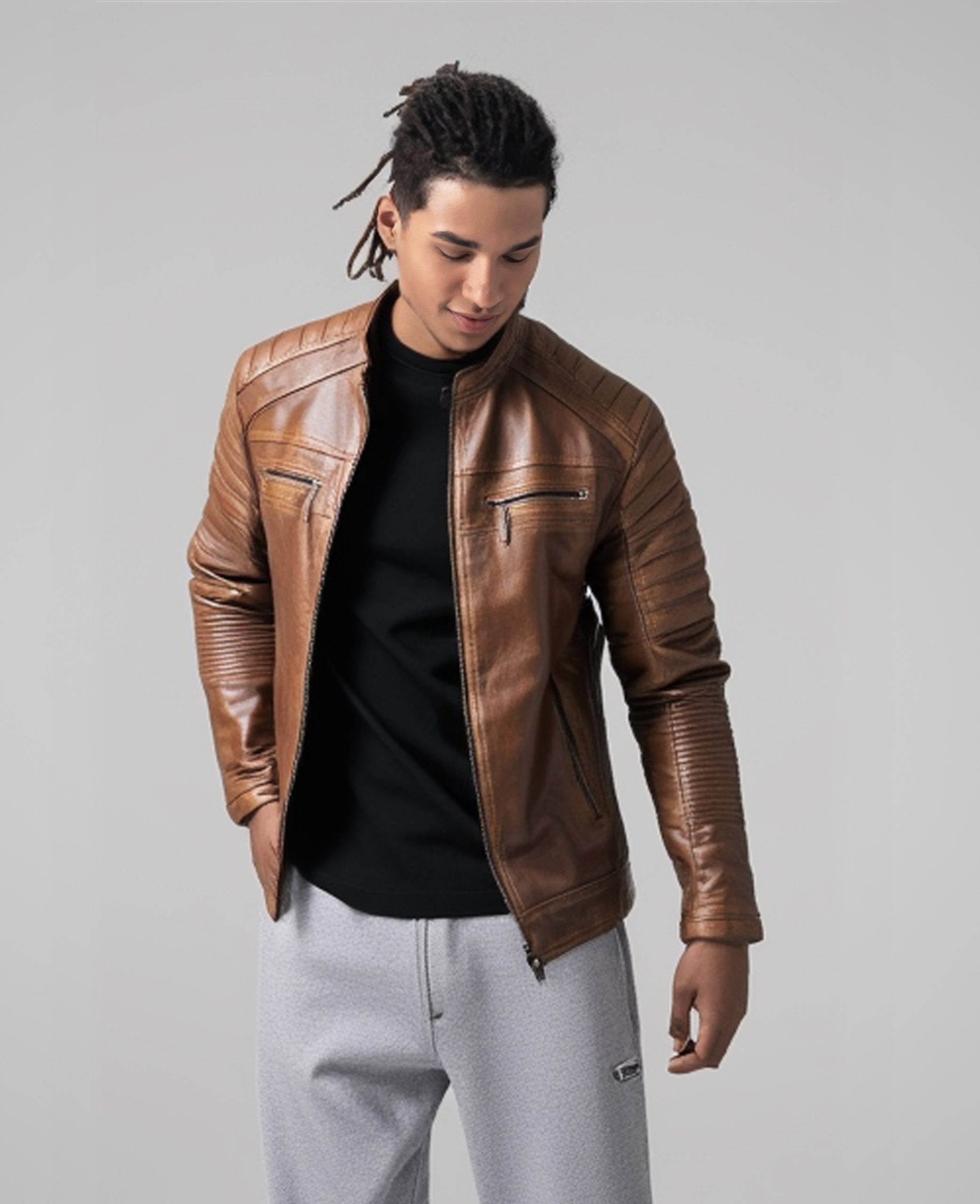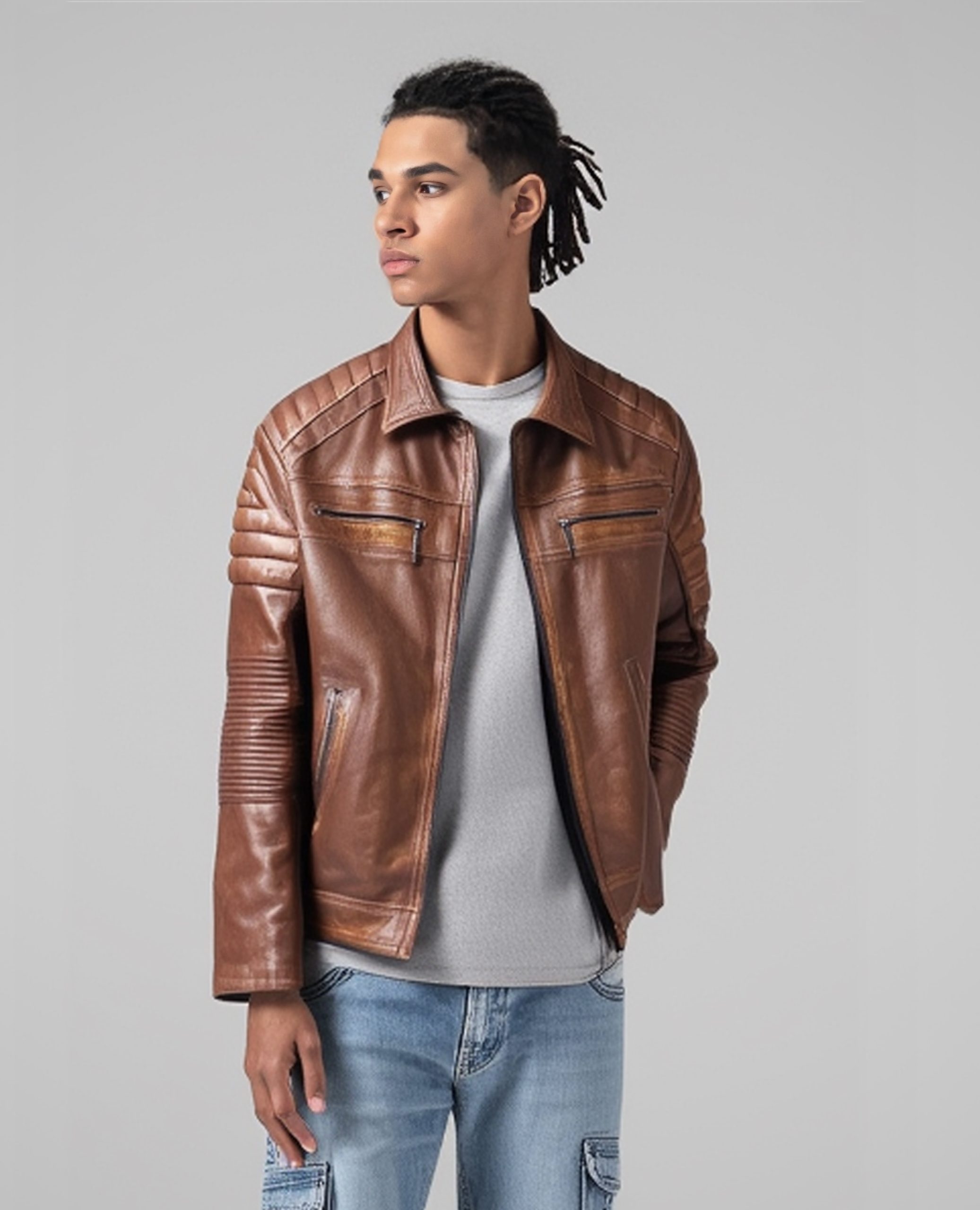 Jaket Kulit Pria Model Biker Warna Coklat Vintage – Jaket Kulit Pria Kode JKT030